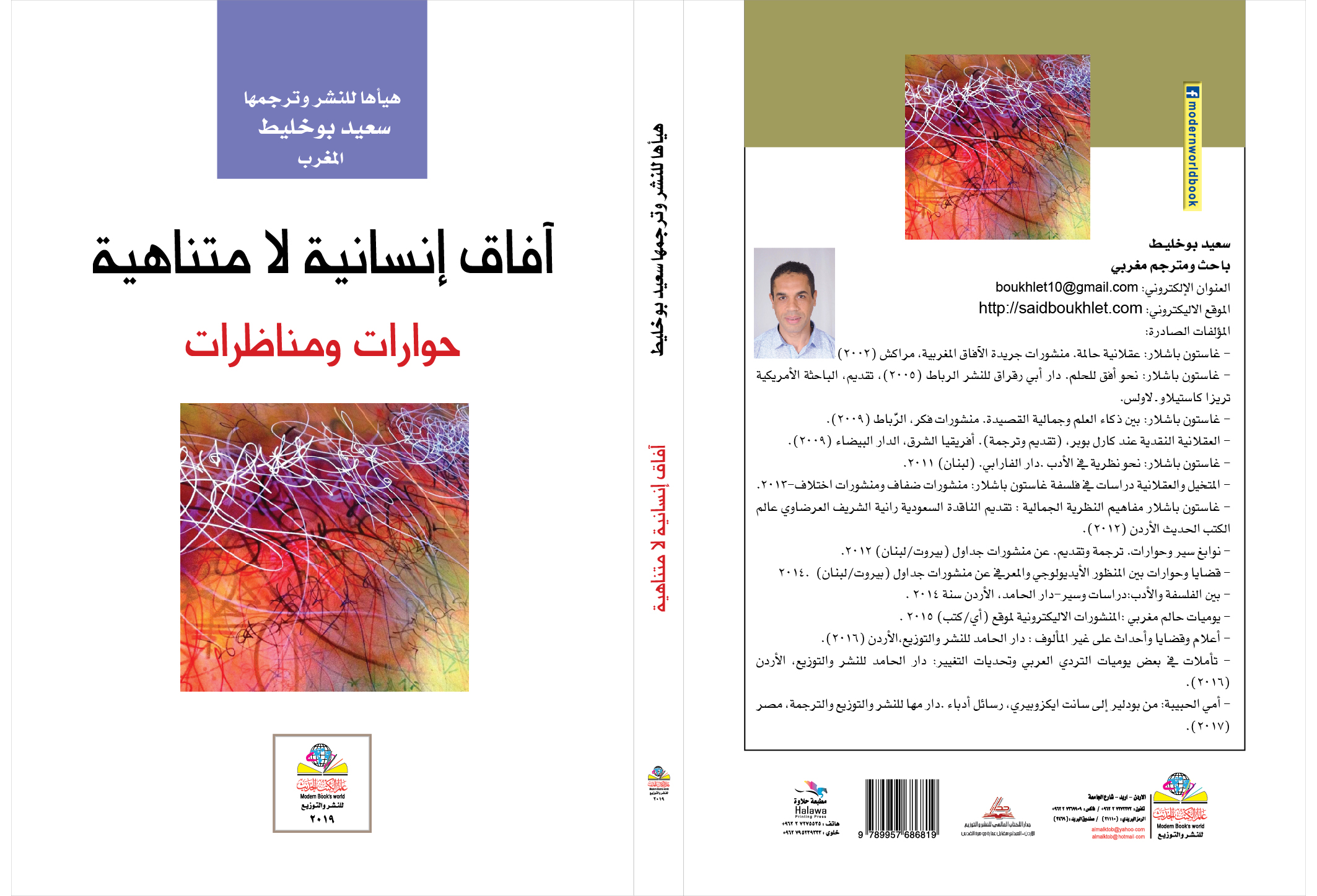صدر حديثا عن دار عالم الكتب الحديث للنشر والتوزيع،في الأردن،عمل جديد للباحث سعيد بوخليط (http://saidboukhlet.com) ،تحت عنوان :آفاق إنسانية لامتناهية،حوارات ومناظرات.تسعى هذه الترجمة إلى العربية، عبر ضمها لمتواليات هذه الفسيفساء الحوارية والتناظرية،عرض وتجميع وتأريخ وتوثيق،أفكار وتصورات بعض الشخصيات المهمة بالنسبة لمسار الثقافة الإنسانية،حاضرا وكذا على امتداد المستقبل البعيد. إطار، حوارات وسجالات ونقاشات،تنوعت مصادر روافدها بين أصول الفلسفة والتاريخ والاقتصاد والموسيقى والطب والصحافة والتشكيل والرواية والأدب والتقنية وعلم الاجتماع،إلخ.بقدر أيضا،انحدار أصحابها وانتماؤهم إلى جغرافيات سوسيو- ثقافية مختلفة،عربية وأوروبية وأمريكية وإفريقية وآسيوية.